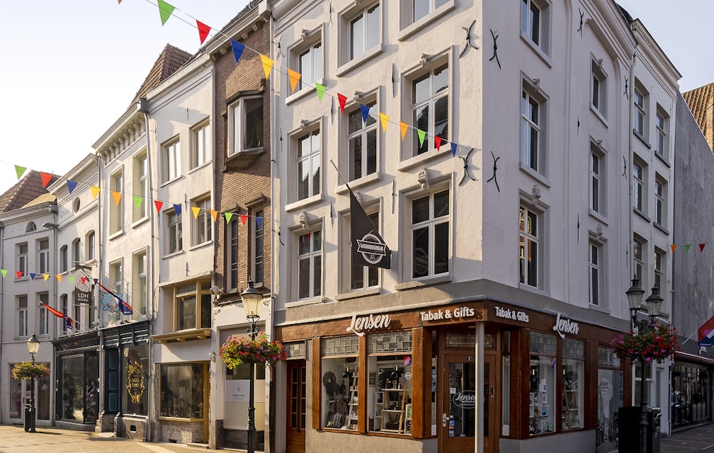 Aan dit belangrijke kruispunt werd eind vijftiende eeuw, begin zestiende eeuw een handelshuis gebouwd. Het pand had een vrijwel vierkant grondplan, een deel van de kelder van een oudere woning werd in het nieuwe huis opgenomen. Elementen uit dat handelshuis zijn bewaard gebleven. Denk aan deuren, kozijnen en trappen. De huidige pui dateert uit de jaren twintig of dertig van de vorige eeuw.